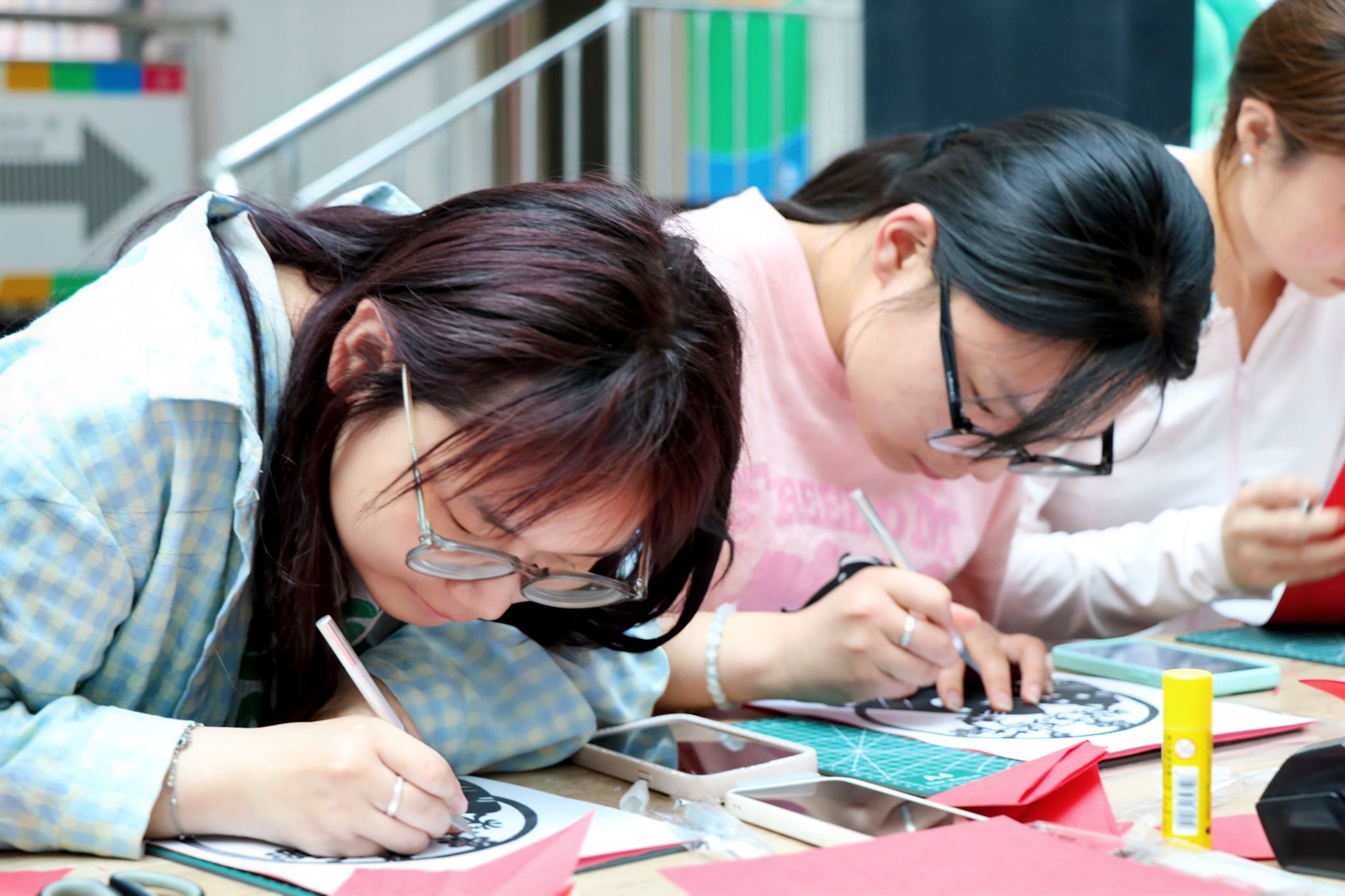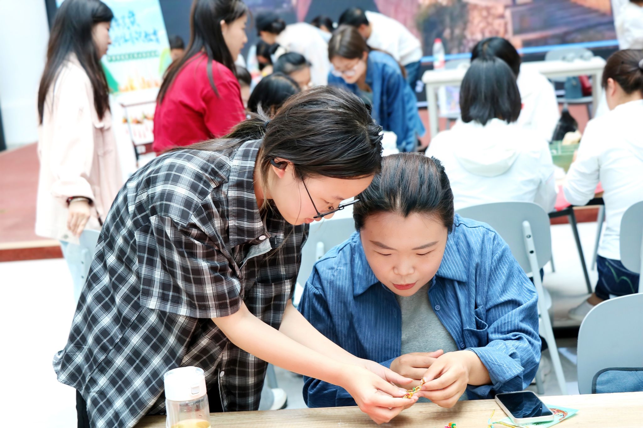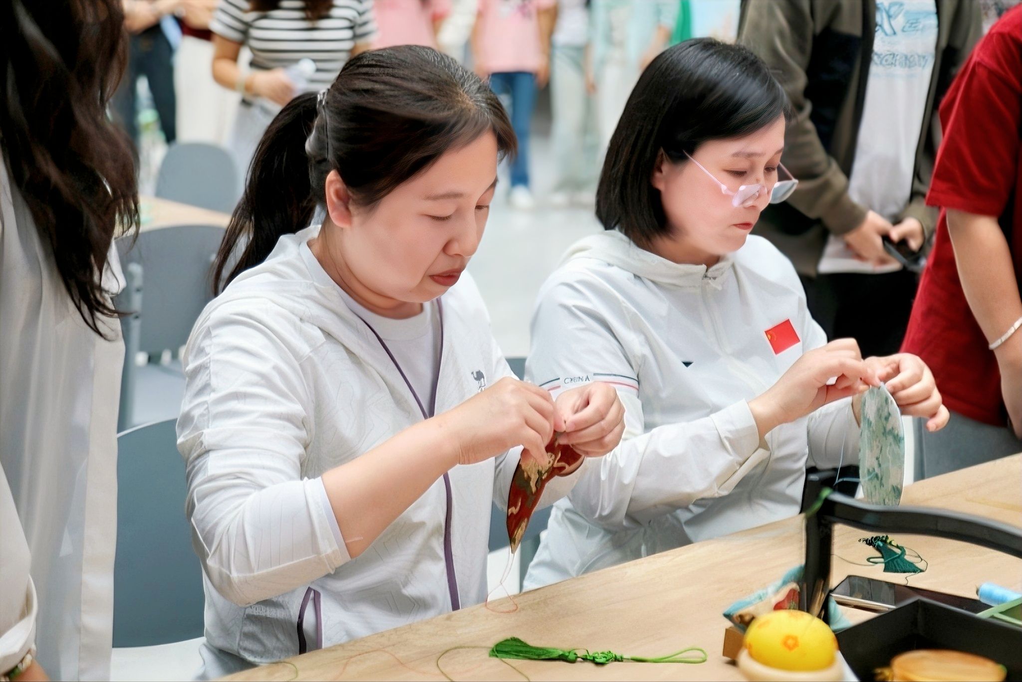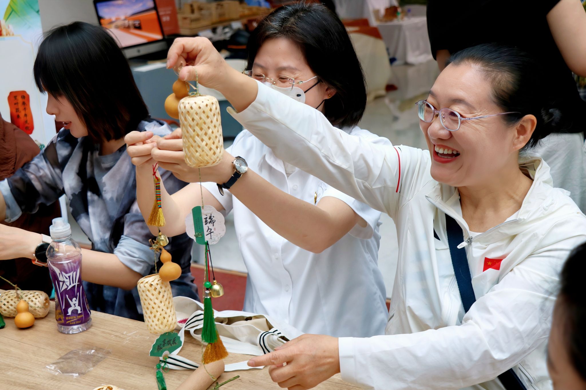 展示结束后,大家开始亲手制作端午剪纸、艾草花束、香囊、五彩绳。在剪纸体验区,大家在张老师的指导下,学习用刻刀创作端午主题剪纸作品;艾草花束制作区清香阵阵,教职工们将艾叶、菖蒲等传统草药精心捆扎成束;香囊缝制区内,彩线穿梭间,一个个蕴含中医药智慧的香囊逐渐成型;五彩绳编织区也很受青睐,五色丝线在指尖缠绕,编织出寓意吉祥的长命缕。