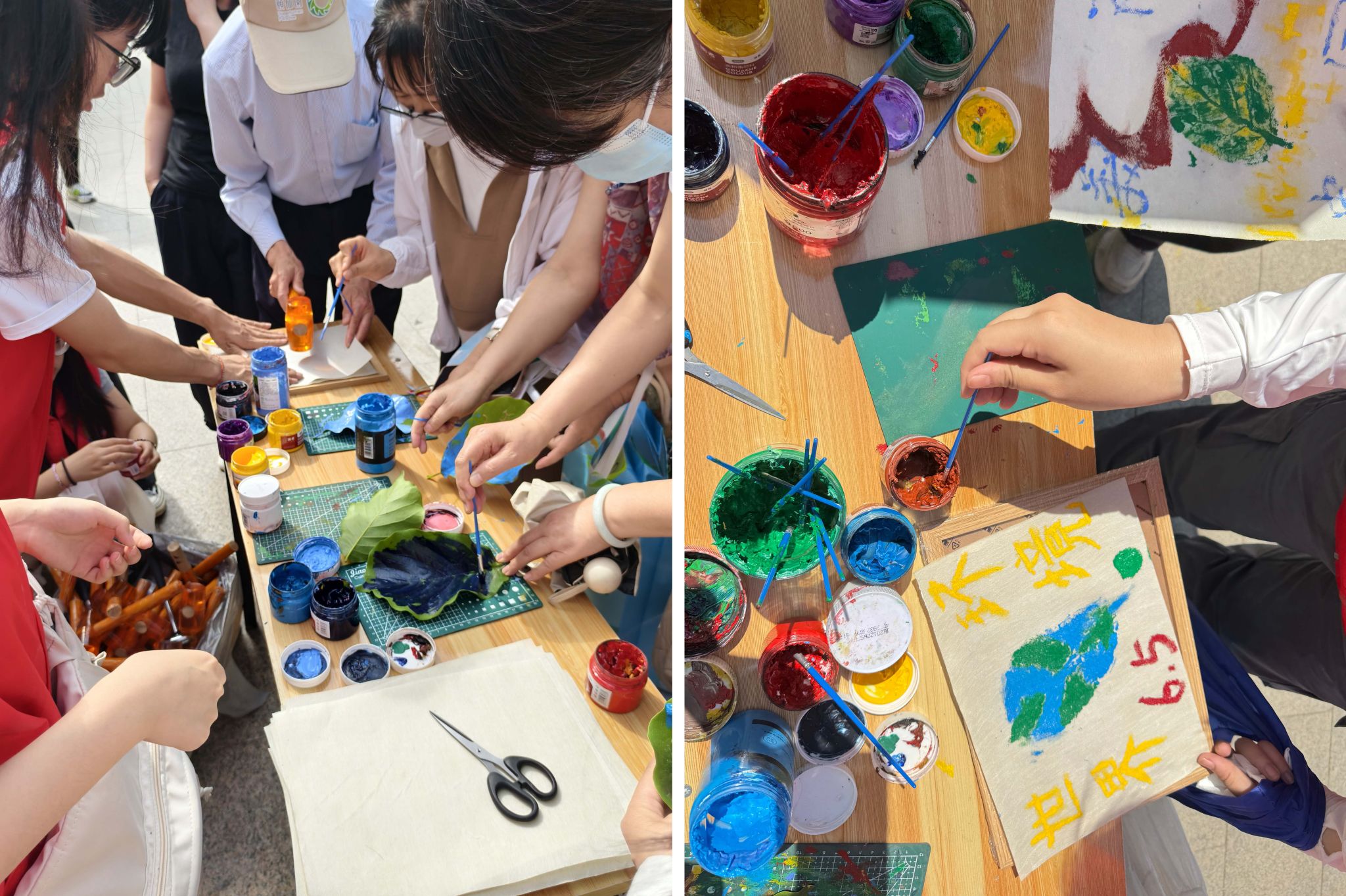 在干花书签DIY活动区,生命科学系学生第二党支部的志愿者们耐心指导市民,利用各类干花和树叶标本精心制作独具匠心的环保书签,不仅展现了植物之美,也传递了绿色生活的理念。在拓印画创作活动区,飞翔协会的同学们带领参与者走进自然,拾取落叶与落花,用画笔在叶片上勾勒出一幅幅生动的图案,再将颜料未干的树叶置于无纺布上,用锤子轻敲拓印,最终制作出一幅幅充满创意的艺术作品。