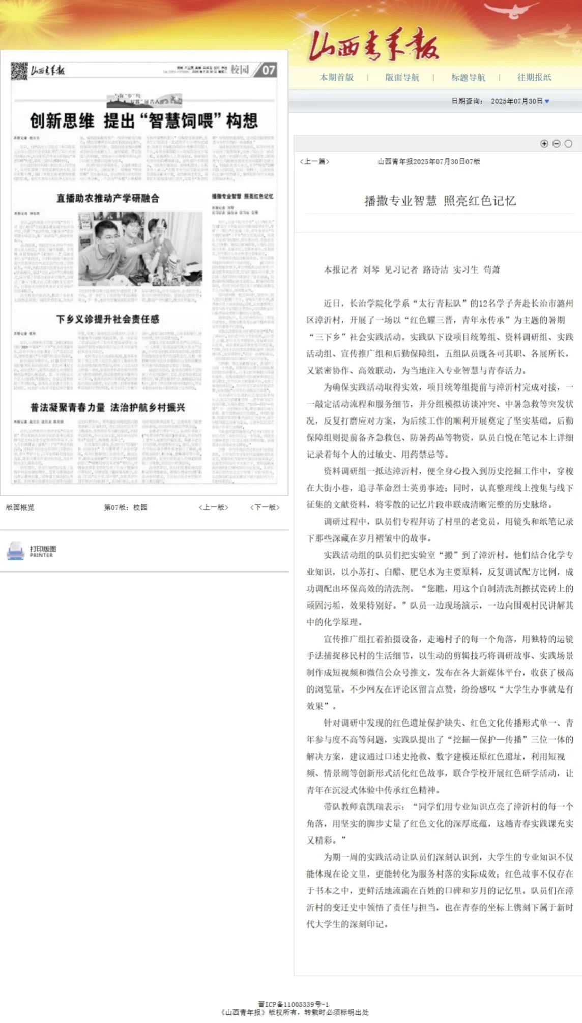 近日,beat365化学系组织的2025年暑期“三下乡”社会实践团队:“太行青耘”队深入长治市潞州区漳沂村开展以“红色耀三晋 青年永传承”为主题的实践活动,因其扎实的成效和显著的育人成果,受到《山西青年报》的关注与专题报道。这既是对化学系实践育人工作的充分肯定,也是对青年学子服务基层、奉献社会热情的极大鼓舞。