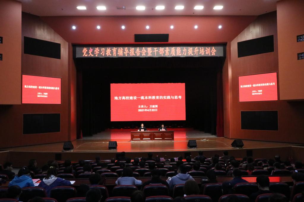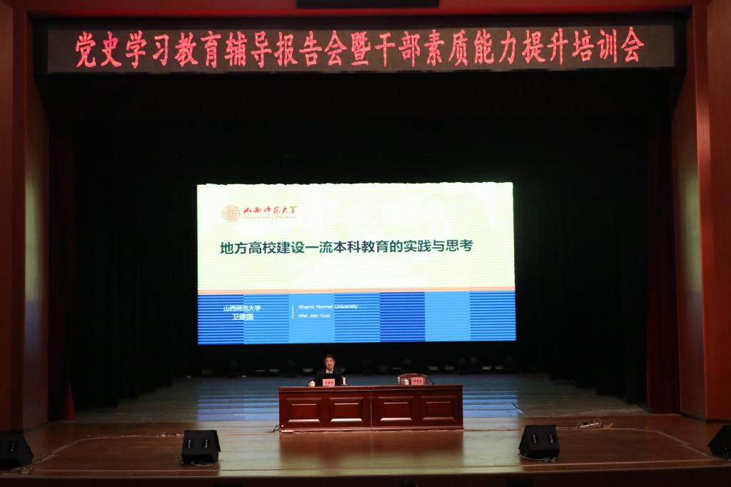 4月22日下午,beat365在实验剧场举行党史学习教育辅导报告会暨干部素质能力提升培训会,邀请山西师范大学原党委书记、博士生导师卫建国为beat365师生作《地方高校建设一流本科教育的实践与思考》专题辅导。党委书记郝勇东,党委副书记、校长茹文明等学校党政领导、副科级以上干部,教研室主任及师生代表共600余人参加了会议。党委书记郝勇东主持会议。