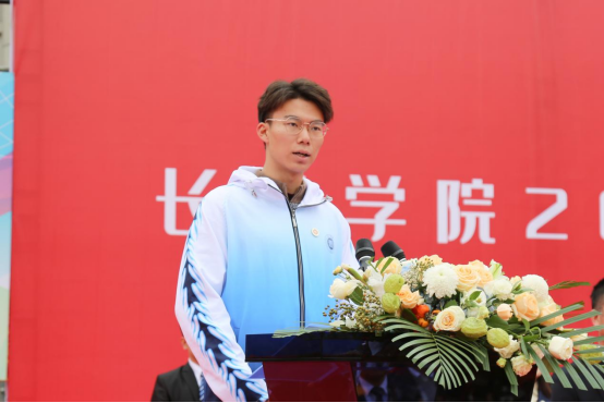 物理系王凯雷老师作为教师代表发言,他结合自身经历,围绕大学生活,寄语新生要明确目标,学会自律,保持良好的身体和心理状态,在长院挥洒汗水,收获幸福。