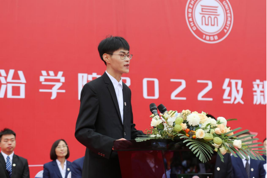 马克思主义学院思政2202班郝宽作为新生代表发言,他代表全体新生向学校领导和老师们的关心与厚爱表示感谢,并表示,将和全体新生一起,坚定理想信念,练就过硬本领,踔厉奋发前行,为长院发展添砖加瓦,为国家建设贡献力量。