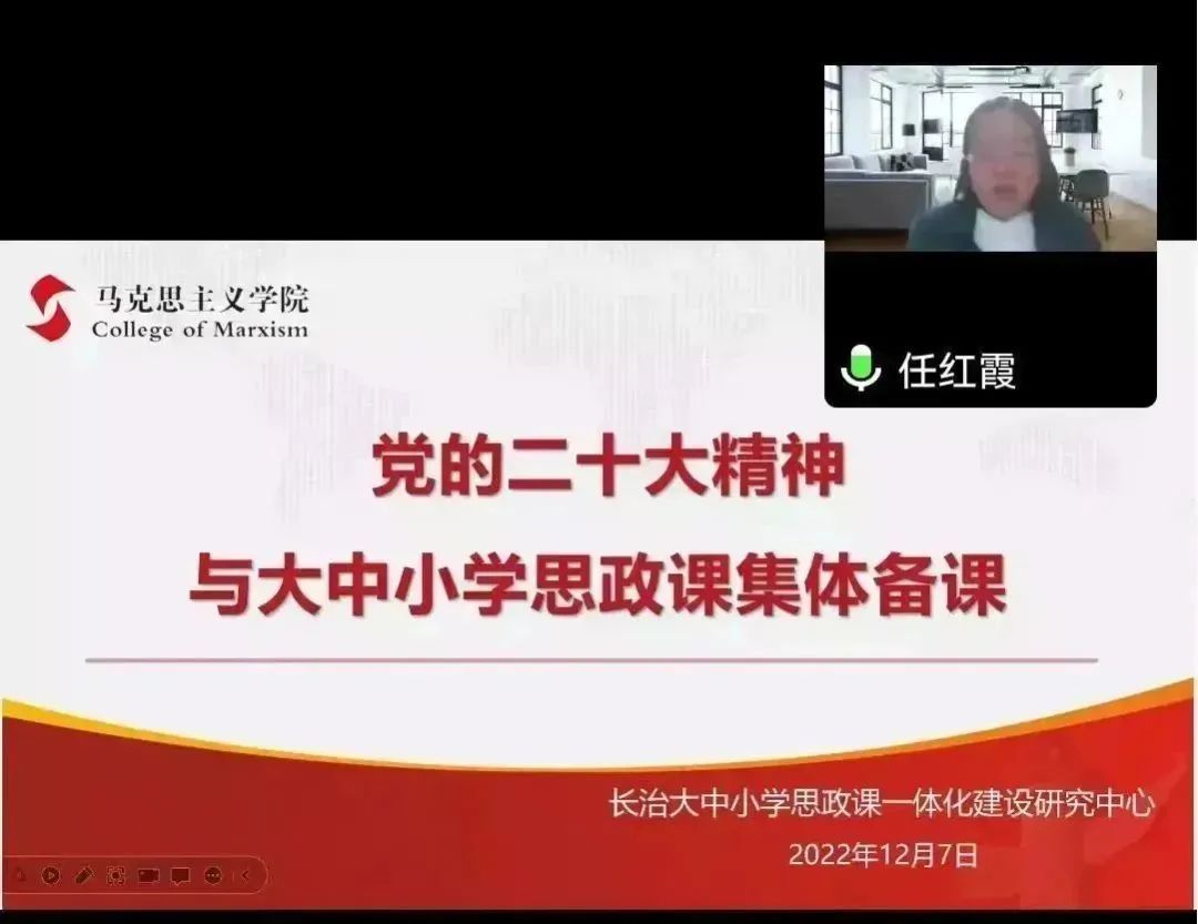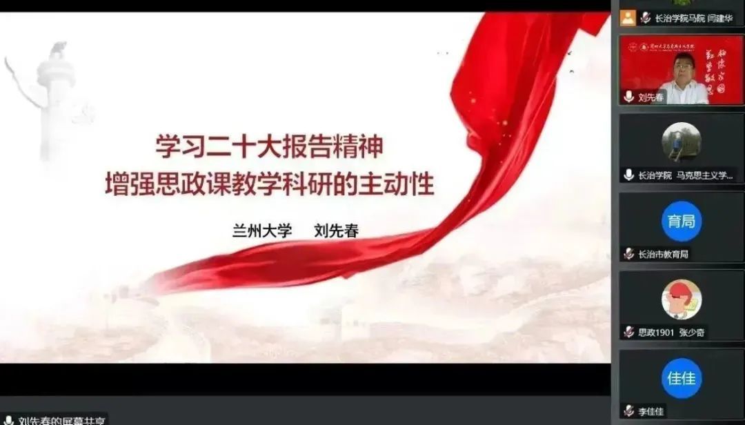 为深入学习宣传贯彻党的二十大精神,扎实推进党的二十大精神进课堂、进头脑,12月7日晚,特邀兰州大学马克思主义学院刘先春教授做“学习二十大报告精神增强思政课教学科研的主动性”线上讲座,讲座由长治市大中小思政课一体化区建设研究中心主办,由beat365亚洲体育官方网站马克思主义学院主任任红霞主持。